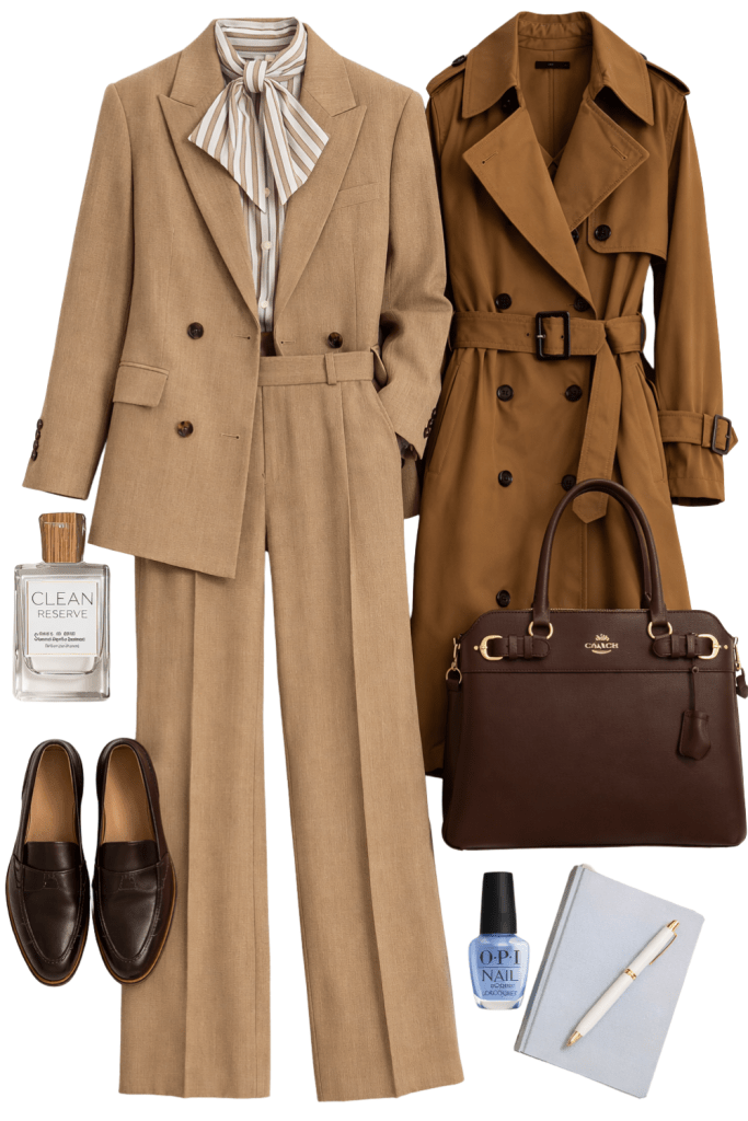 Career fairs are more than networking opportunities—they’re your chance to make a strong first impression before you even say a word. Dressing with intention allows your style to reflect confidence, professionalism, and readiness for the opportunity ahead. For this look, a tailored neutral suit creates a polished foundation that transitions effortlessly from a career fair to the workplace. Structured blazers and tailored trousers offer a refined silhouette, while a soft blouse adds balance and sophistication. Classic loafers keep the outfit practical and comfortable for a full day of walking, networking, and meaningful conversations. A trench coat adds another layer of intention to the look—elevating the outfit while remaining timeless and professional. Thoughtful accessories like a structured handbag, a simple notebook for notes, and a subtle fragrance complete the ensemble with quiet confidence. For the intentional woman, style is not just about appearance—it’s about showing up prepared, polished, and aligned with the goals she’s stepping into.